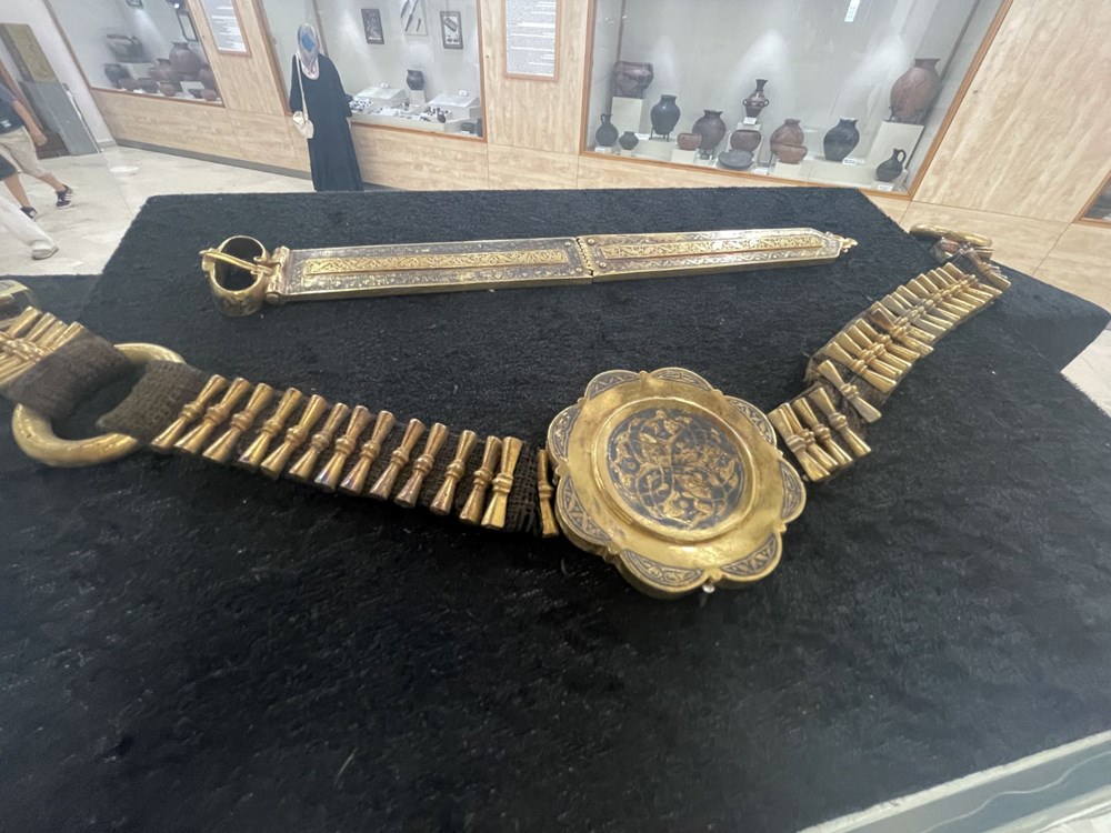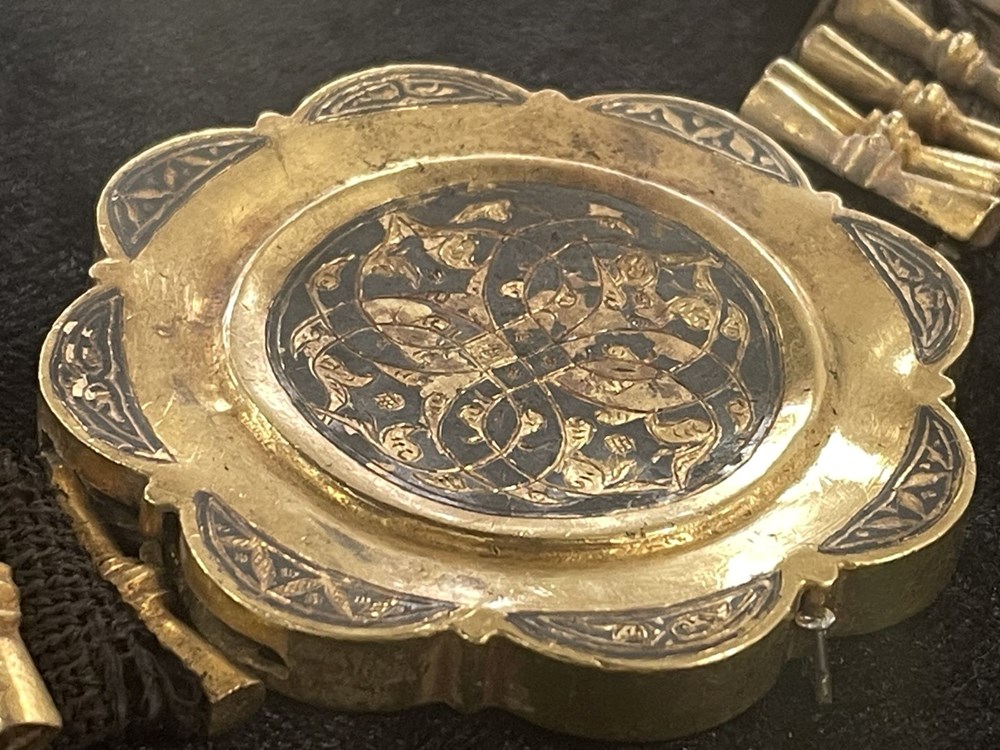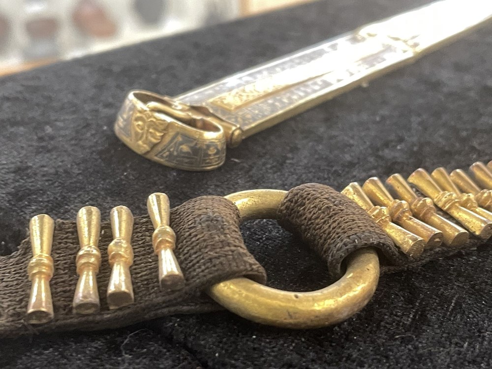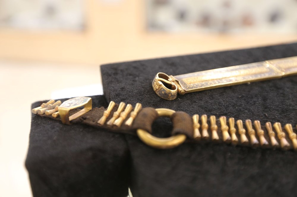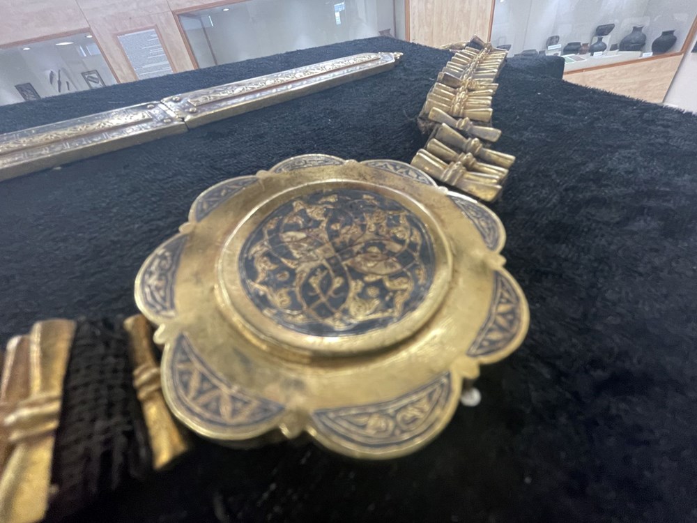“Kemer 3 bölümden oluşmaktadır, birincisi kemer tokası, ikincisi tekstil parça üzerindeki kemer halkalar ve kemer levhasından oluşuyor. Tamamı altın malzemeden yapılmıştır, üzerinde süslemeler bulunmaktadır. Ortadaki kemer tokası 8 dilimli olarak yapılmış ve kenarlarında savat işçiliği görülmektedir. Kemer levhasına baktığımızda 25 santimetre uzunluğunda, 2,5 santimetre genişliğindedir.”
