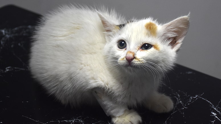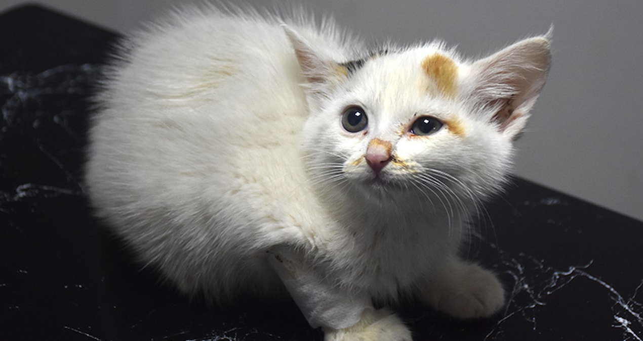Kediyi bulunduğu yerden çıkaranlar, baygın ve başının şişmiş olduğunu görünce özel bir veteriner kliniğine getirdi. Buradaki ilk müdahalesinde bilincinin kapalı ve başında yoğun ödem oluştuğu tespit edilen yavru kedi, yoğun bakıma alındı.