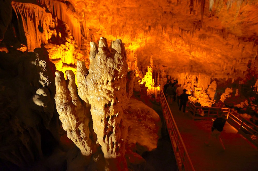 Denizden 45 metre yükseklikteki yamaçta olan, 555 metre yatay uzunluğa ve 46 metre derinliğe sahip mağarada dev boyutlara ulaşan damla taşlar, ana galeriyi çok sayıda salon ve odaya ayırıyor.