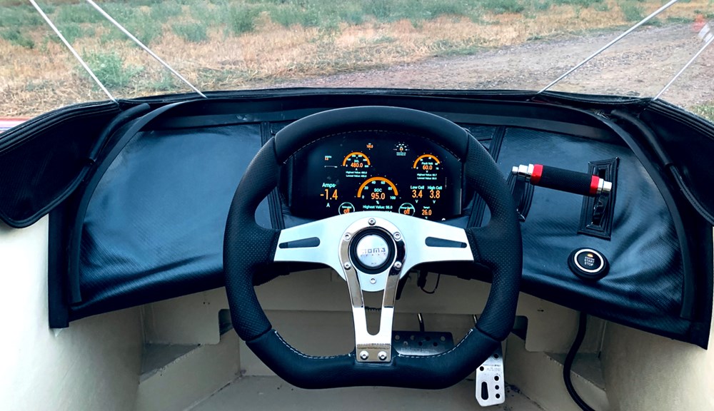 Araç, savaş uçağı gibi oturma düzenine sahip açık bir kokpite, gizli arka tekerleklere ve dijital bir gösterge panosuyla öne çıkıyor.