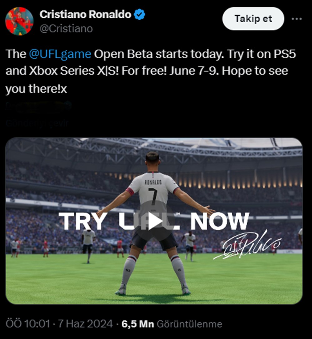 Cristiano Ronaldo, X hesabından yaptığı paylaşımda “UFL oyununun Açık Betası bugün başlıyor. PS5 ve Xbox Series X|S’de ücretsiz deneyin! 7-9 Haziran. Umarım orada görüşürüz!” ifadelerini kullandı.