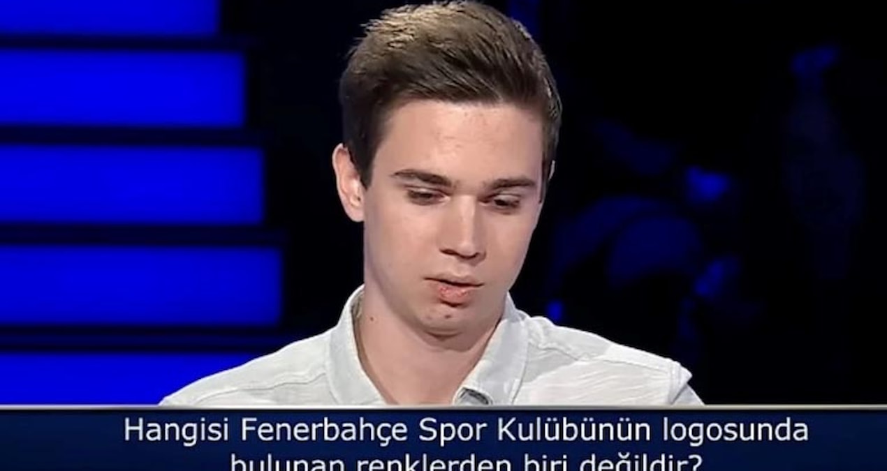 ‘Kim Milyoner Olmak İster?’ yarışmasına katılan Fenerbahçeli bir gencin, “Hangisi Fenerbahçe Spor Kulübü’nün logosunda bulunan renklerden biri değildir?” sorusuna verdiği yanıt gündem oldu.