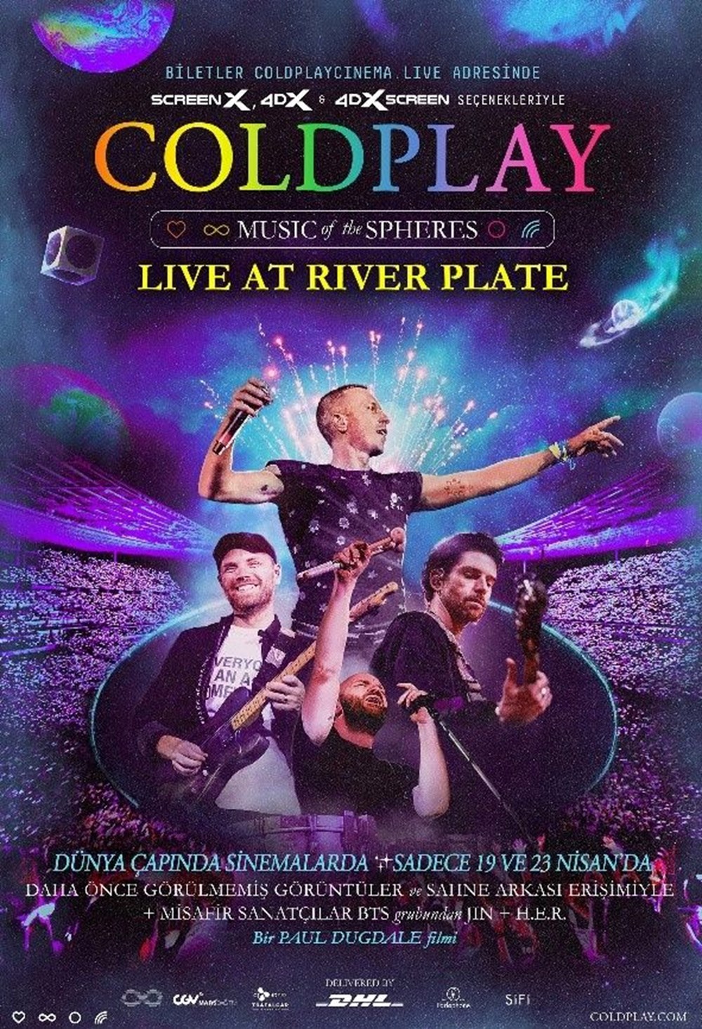 Dünyanın en çok sevilen gruplarından Coldpay’in konserini beyaz perdeye taşıyan Coldplay – Music of the Spheres: Live at River Plate, grubun Buenos Aires’te on gece üst üste River Plate Stadyumu’nda kapalı gişe verdiği bu muhteşem konseri izleyicilerle buluşturuyor.