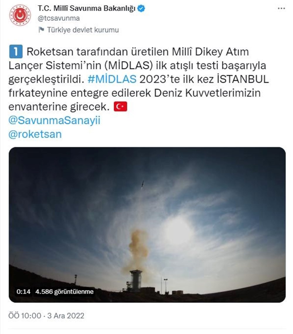 Milli Savunma Bakanlığı’nın Twitter’daki hesabından yapılan açıklamaya göre, Roketsan tarafından üretilen ve deniz platformları dikey atım lançer sistemi ihtiyacında dışa bağımlılığa son verecek MİDLAS’ın ilk atışlı testi başarıyla gerçekleştirildi. Dünyada sayılı ülkenin üretebildiği güverte altı dikey atım lançer sistemi MİDLAS, 2023’te ilk kez İstanbul fırkateynine entegre edilerek Deniz Kuvvetleri Komutanlığı’nın envanterine girecek. Böylece Türkiye, kendi tasarlayıp ürettiği gemisinden, kendi lançeri ve kendi hava savunma füzesini kullanabilen dünyadaki sayılı ülkelerden biri olacak. Açıklamada, “Ülkemizin deniz platformları dikey atım lançer sistemi ihtiyacında dışa bağımlılığına son verecek olan MİDLAS’ın hayata geçirilmesinde emeği geçenleri kutluyor, başarılarının devamını diliyoruz. MİDLAS şimdiden Deniz Kuvvetlerimize hayırlı olsun” denildi.