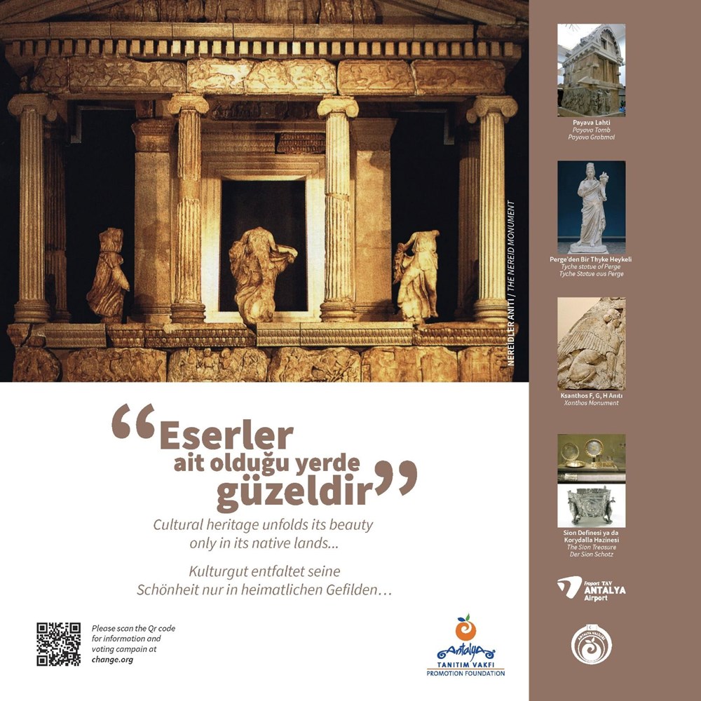 Kaçırılan tarihi eserlerin yurda dönmesi için başlatılan kampanya sürüyor. Antalya Tanıtım Vakfı’nın (ATAV) yurt dışına kaçılan 8 tarihi eserin iadesi için change.org’da başlattığı “Eserler Ait Olduğu Yerde Güzeldir” adlı projeye destek verenlerin sayısı 25 bine yaklaştı.