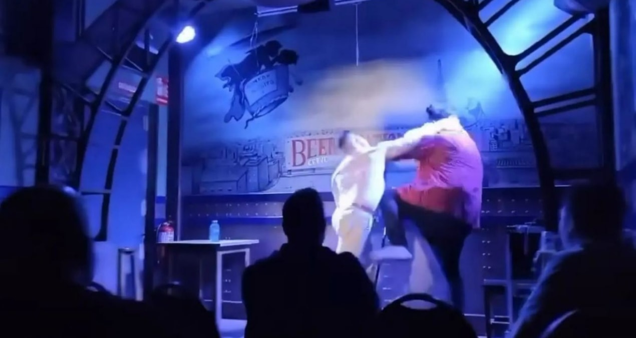 Komedyen Jaime Caravaca, pazartesi gecesi Madrid’deki gösterisinin ortasındayken öfkeli baba Alberto Pugilato’nun aniden sahneye çıkmasıyla yumruklandı.